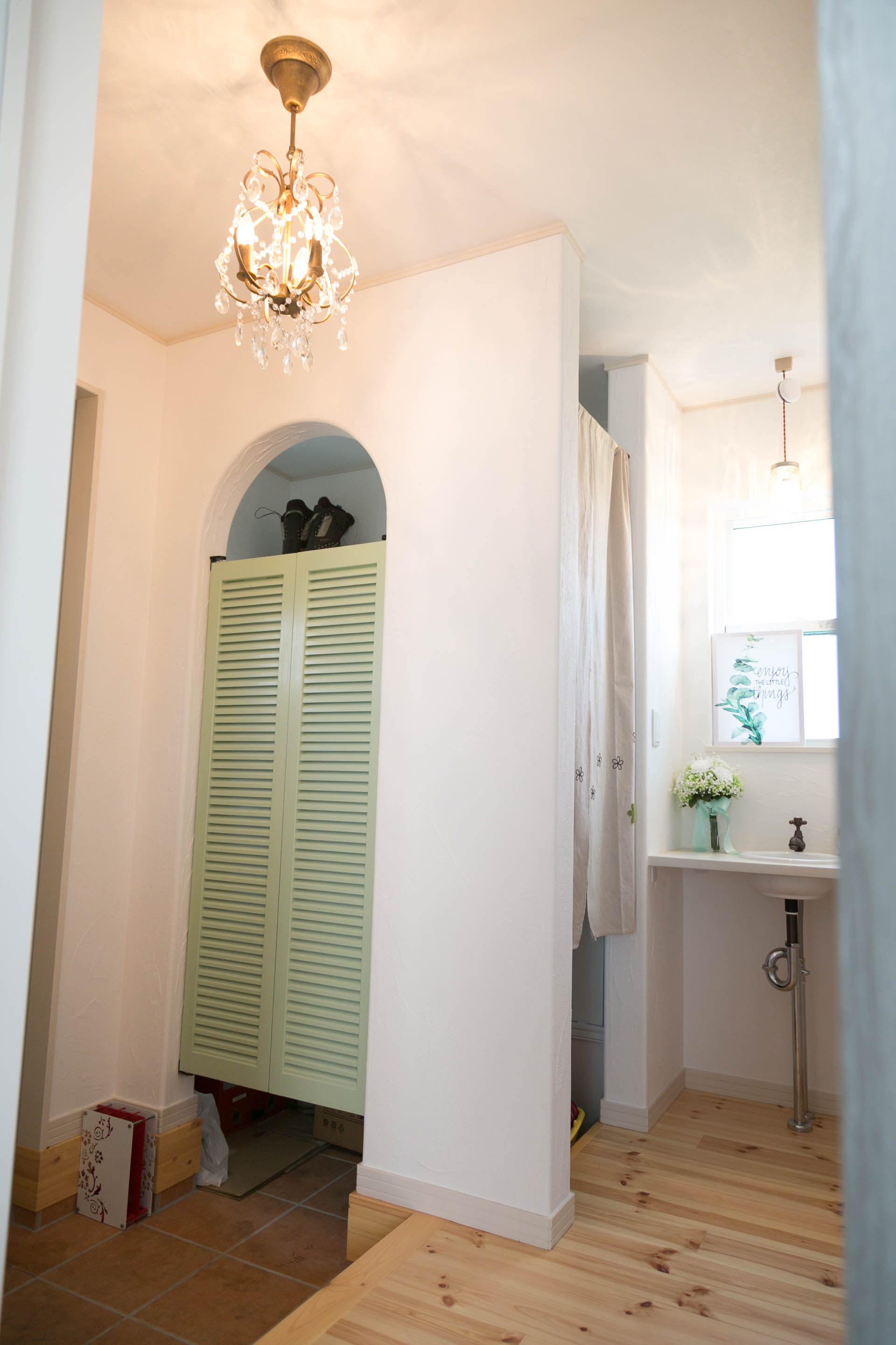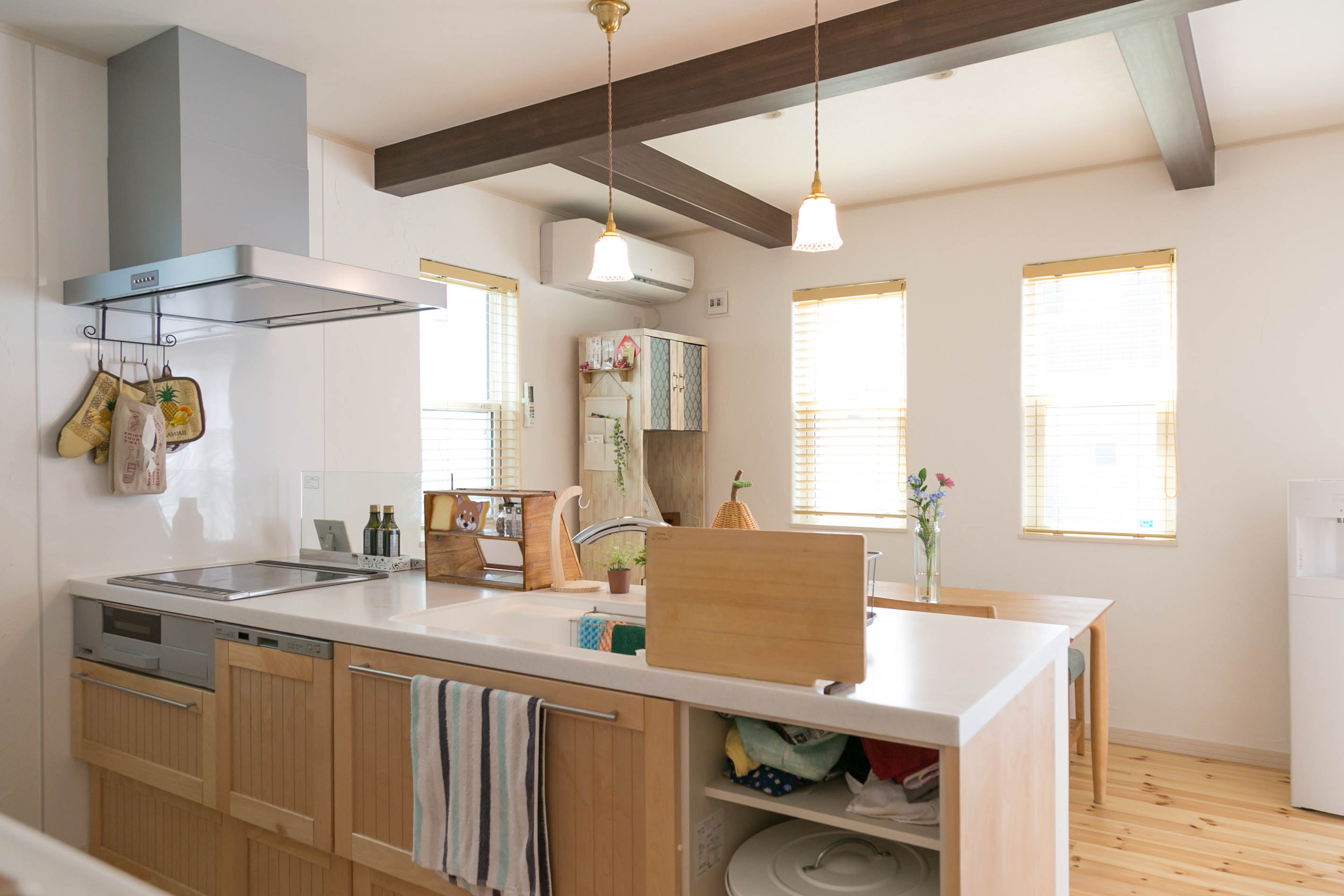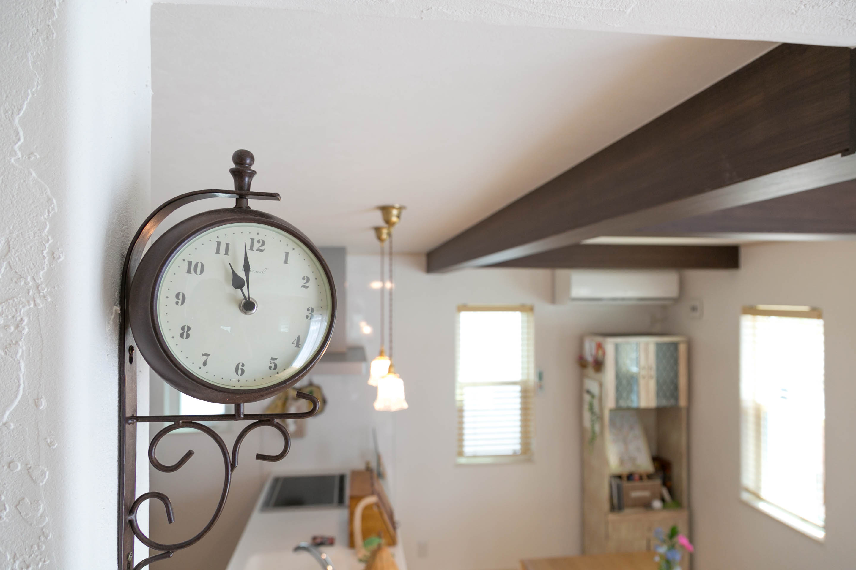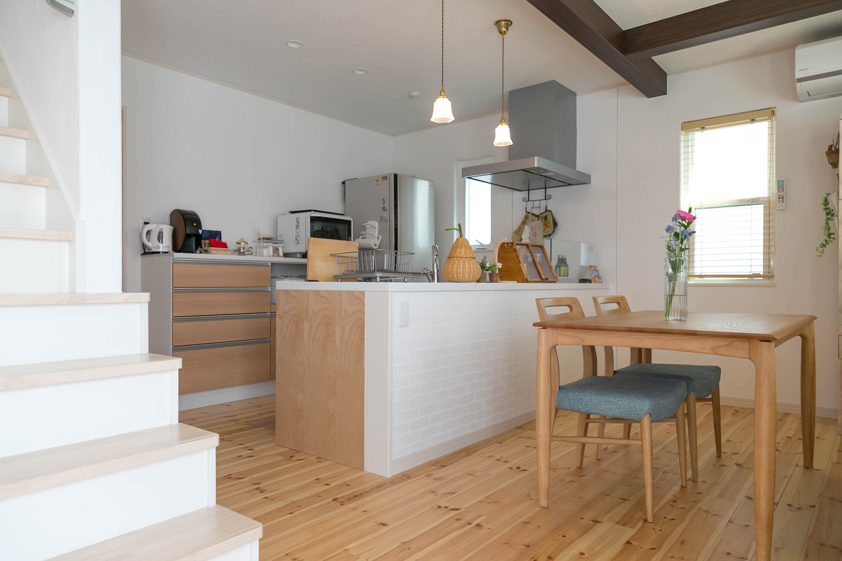 奥さまお気に入りの丸窓が印象的な可愛らしいお宅でした。扉や小物、憧れだったとお話しくださった梁など細やかなこだわりが、それぞれの空間のアクセントになっていて素敵でした。シンプルな間取りでありながら、奥さまのために考えられた動線はその日、心地よく吹く風の通り道でもありました。