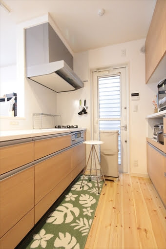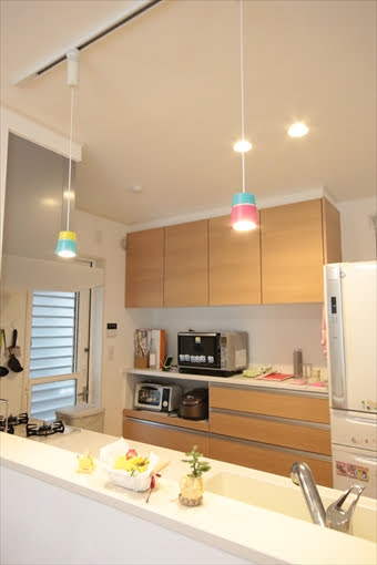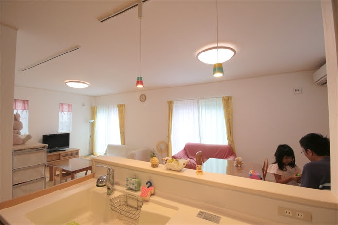 キッチンです。娘が一緒に立ちたがるのでアパートの頃は狭くて大変でした(苦笑)お手伝いがしたい時期はまだしばらく続きそうだから今の広さがあって良かったです。子どもたちがリビングで遊んでいるときは見渡せるので、家事の手を止めずに見られます。システムキッチンも、拭き取りのお掃除がしやすいし天板の白は傷が目立たないので気に入っています。シンクの中は沈着汚れを考えて、少しだけ色味を付けてもらってるんですよ。