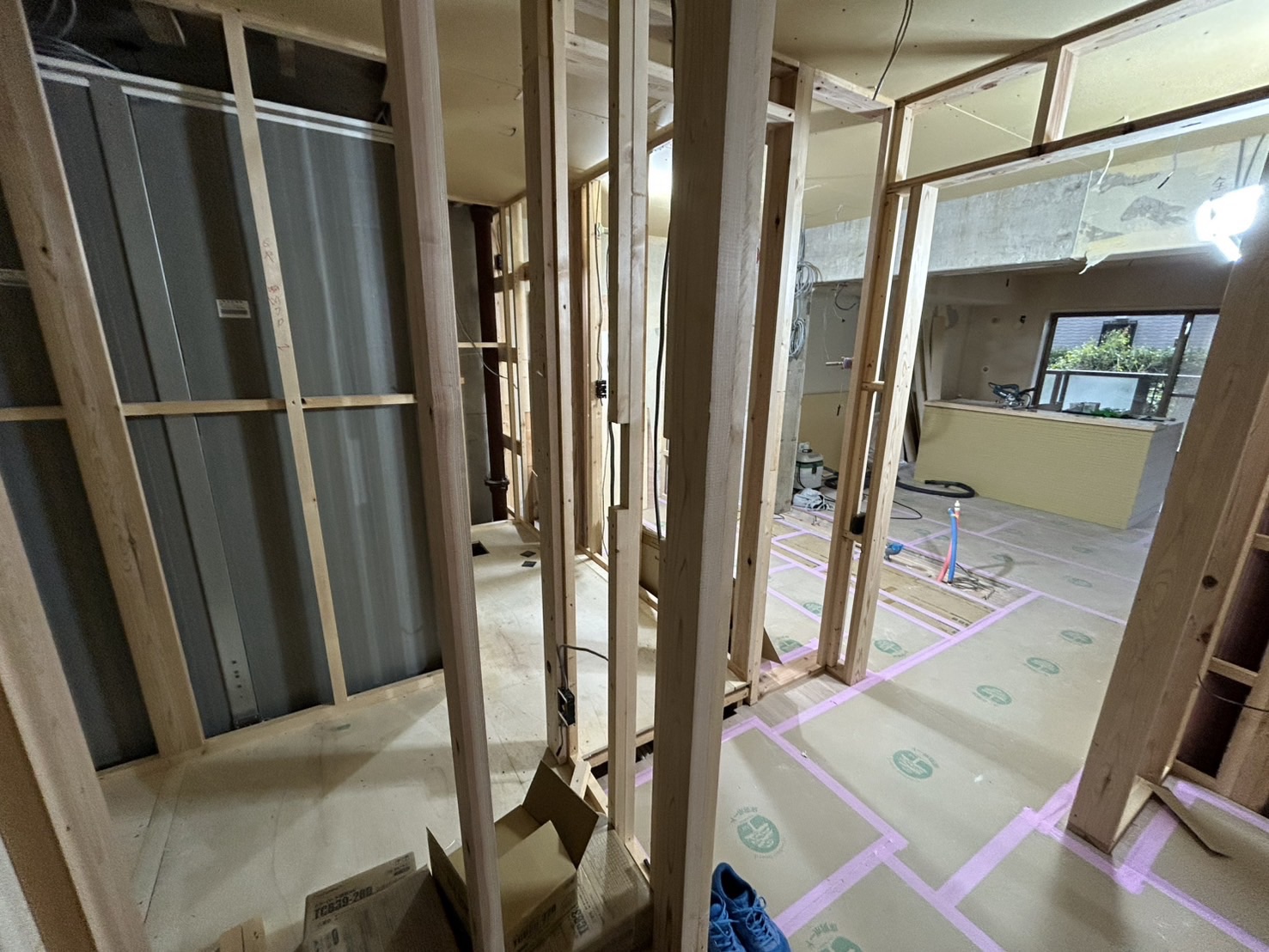 マンションリノベ間仕切り施工しています。段々と形が見えてきました。