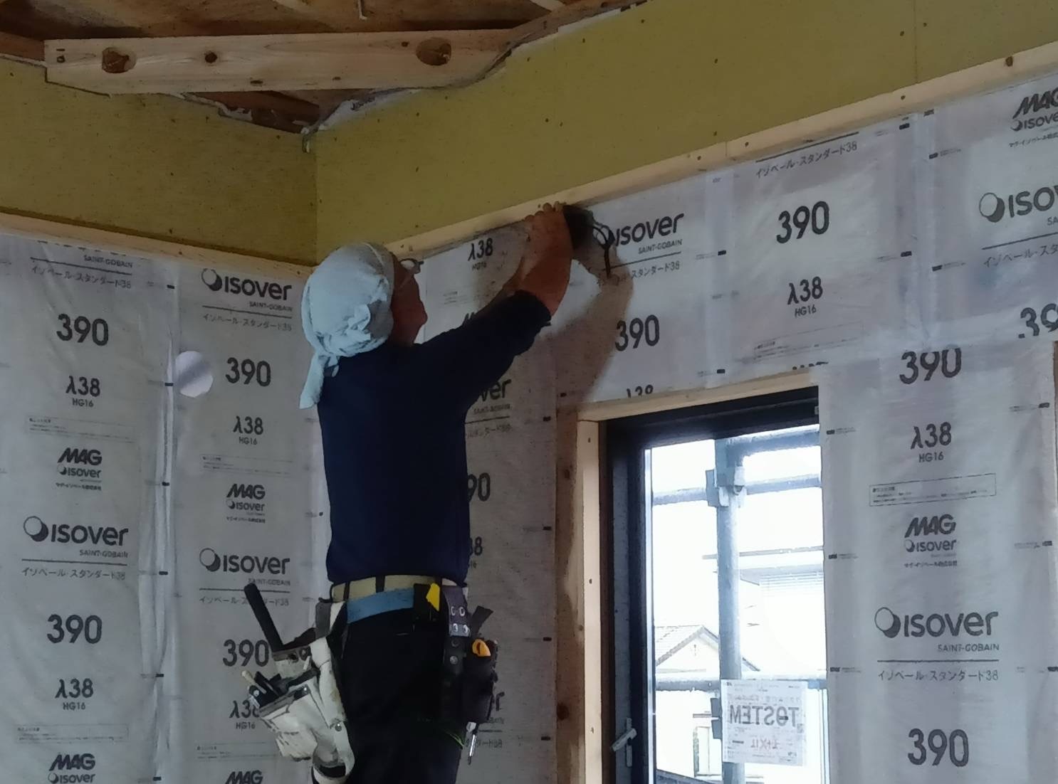 はい。こちらでは壁、天井の断熱材を施工しています。断熱材入れると現場の体感温度ほんとに変わります。外の暑さや寒さも和らぎますからね。