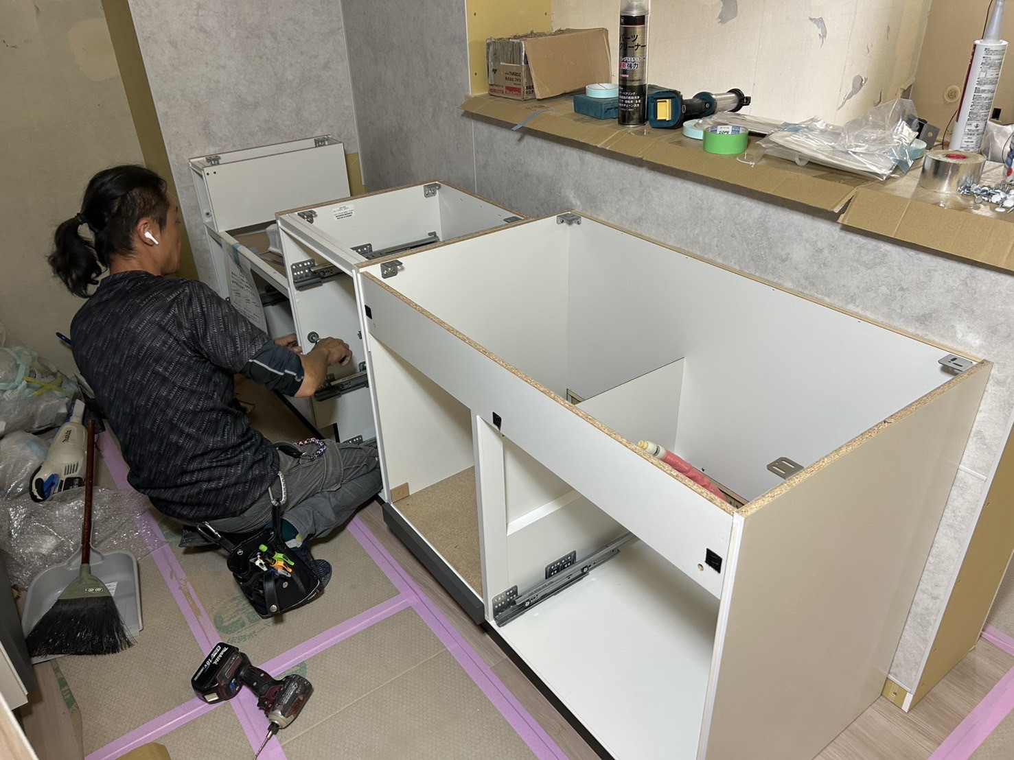 キッチンの組み立てに入りました。大工さんの仕事もあと少しで終わりです👷